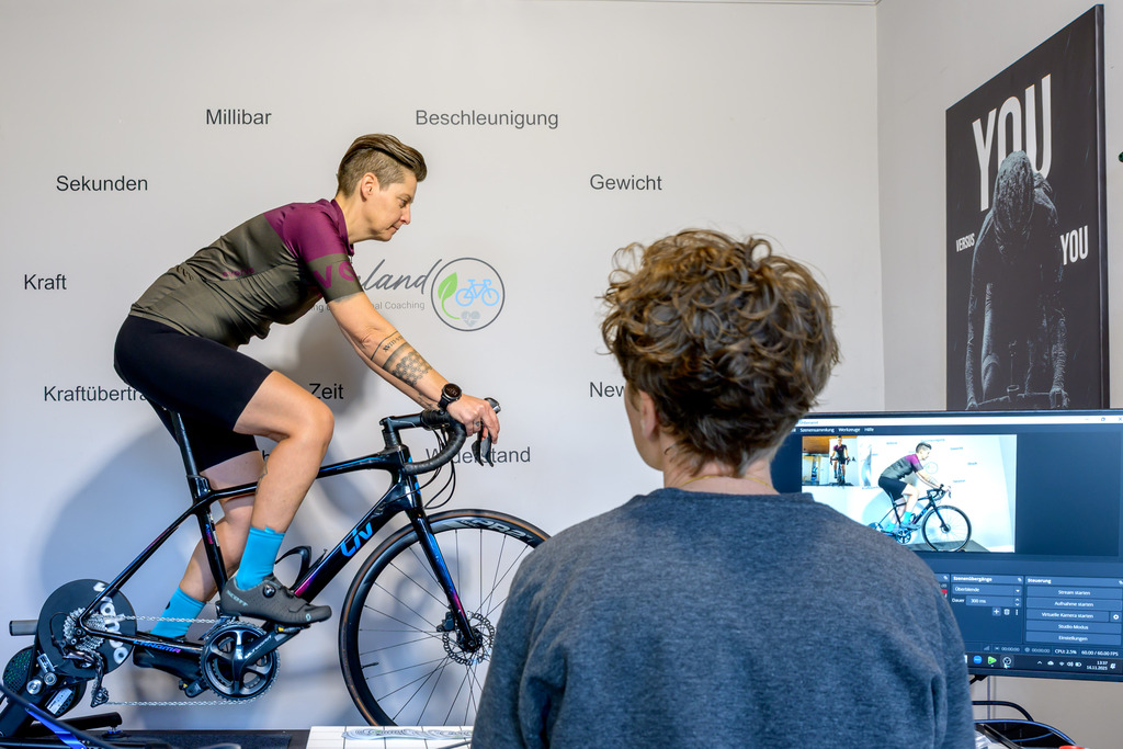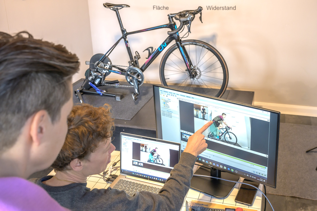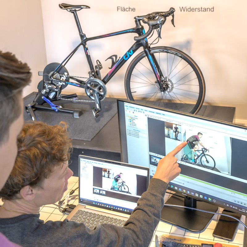 Während du auf dem Rad sitzt, schaue ich mir mit geschultem Auge genau an, wie die Kraft an den drei Kontaktstellen – Sattel, Pedal und Lenker – verteilt ist und wie es sich mit der Stabilität verhält. Dafür nutze ich ebenfalls ein Kamerasystem, um den dynamischen Prozess konkret nachvollziehen und mit dir gemeinsam analysieren zu können.